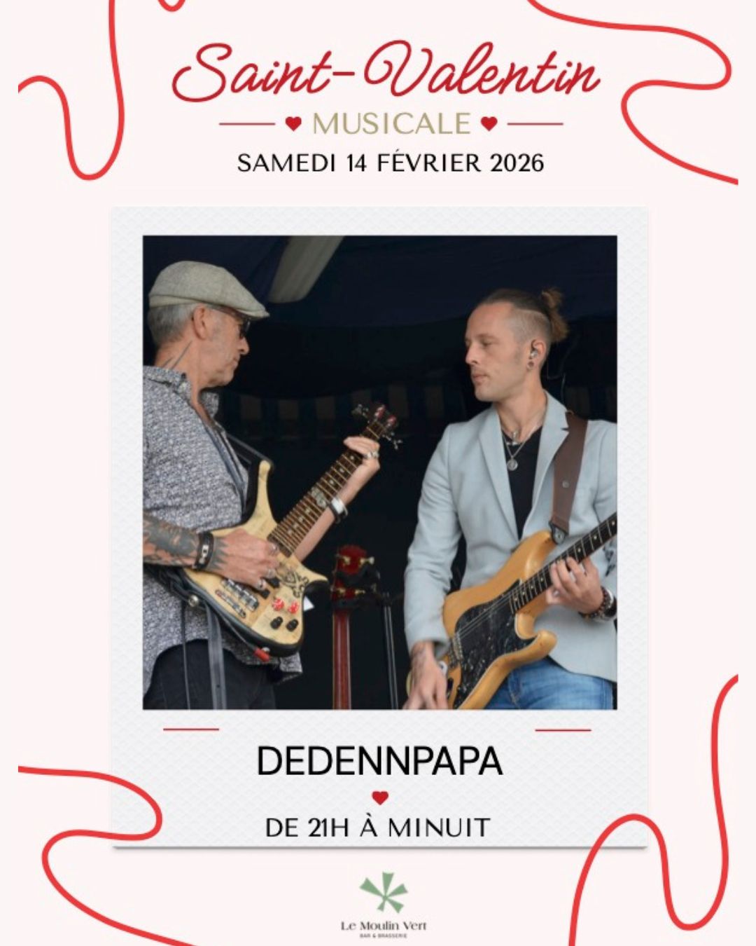 @dedennpapa sera en live de 21h à minuit pour accompagner vos tête-à-tête d’une belle énergie. Un duo, des guitares, du groove : tout ce qu’il faut pour une soirée qui vibre autant que vos cœurs.